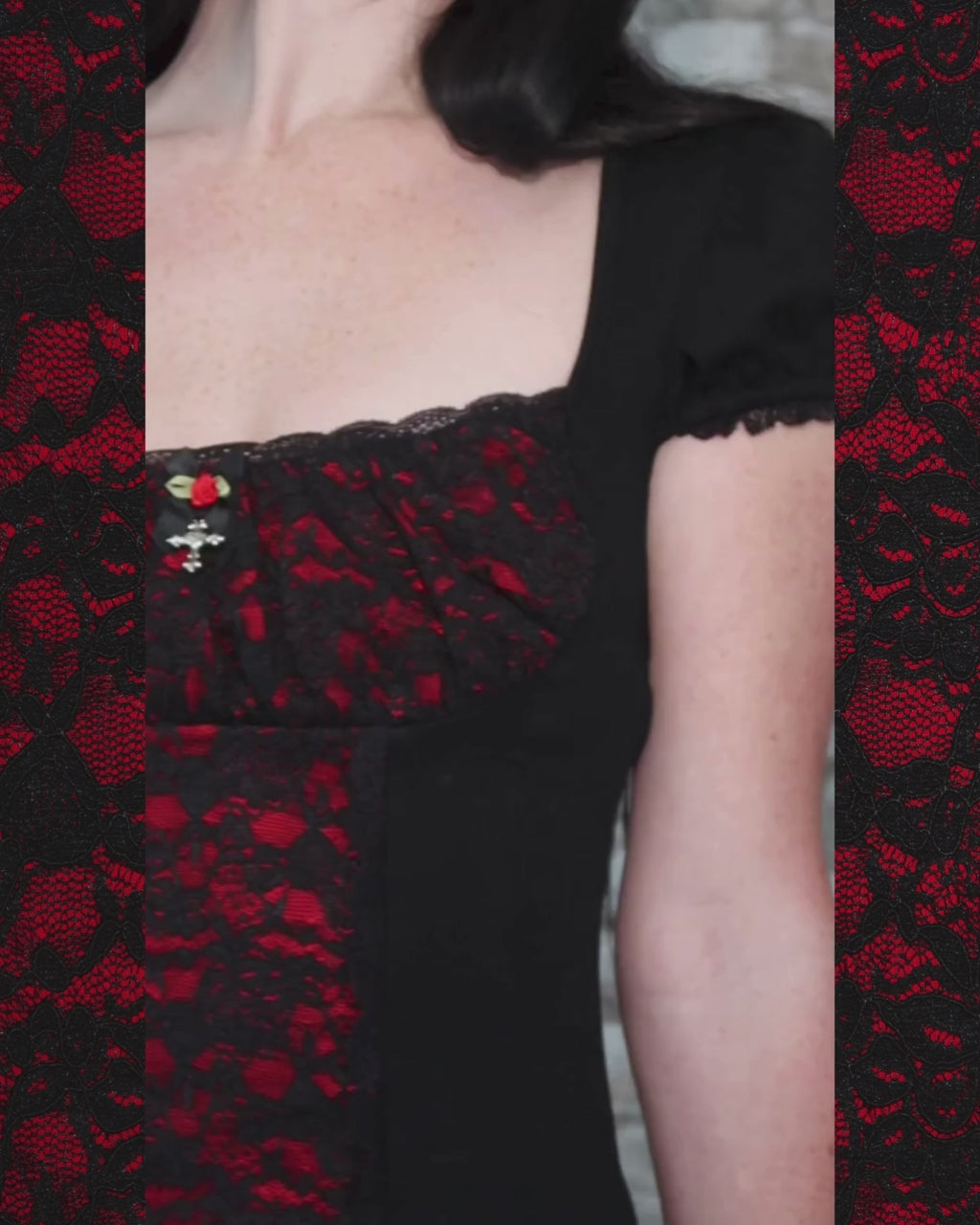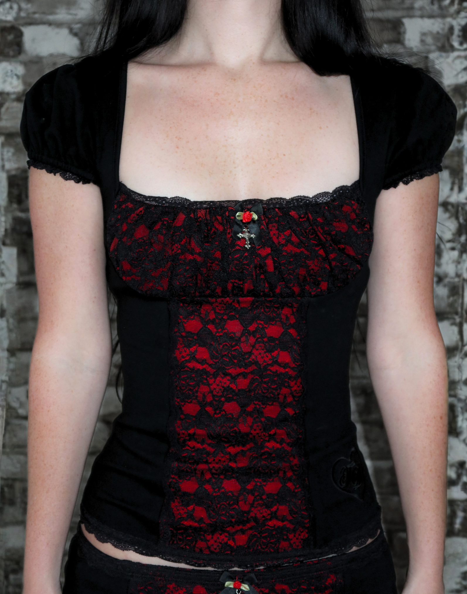 The Roseblood Claire top comes with a milkmaid bust, puff sleeves, lace detailing, and a custom Truth or Dare charm.