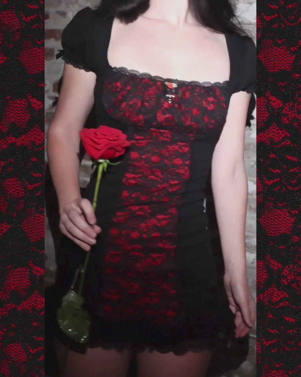 The Roseblood Dress top comes with a milkmaid bust, puff sleeves, lace detailing, and a custom Truth or Dare charm.