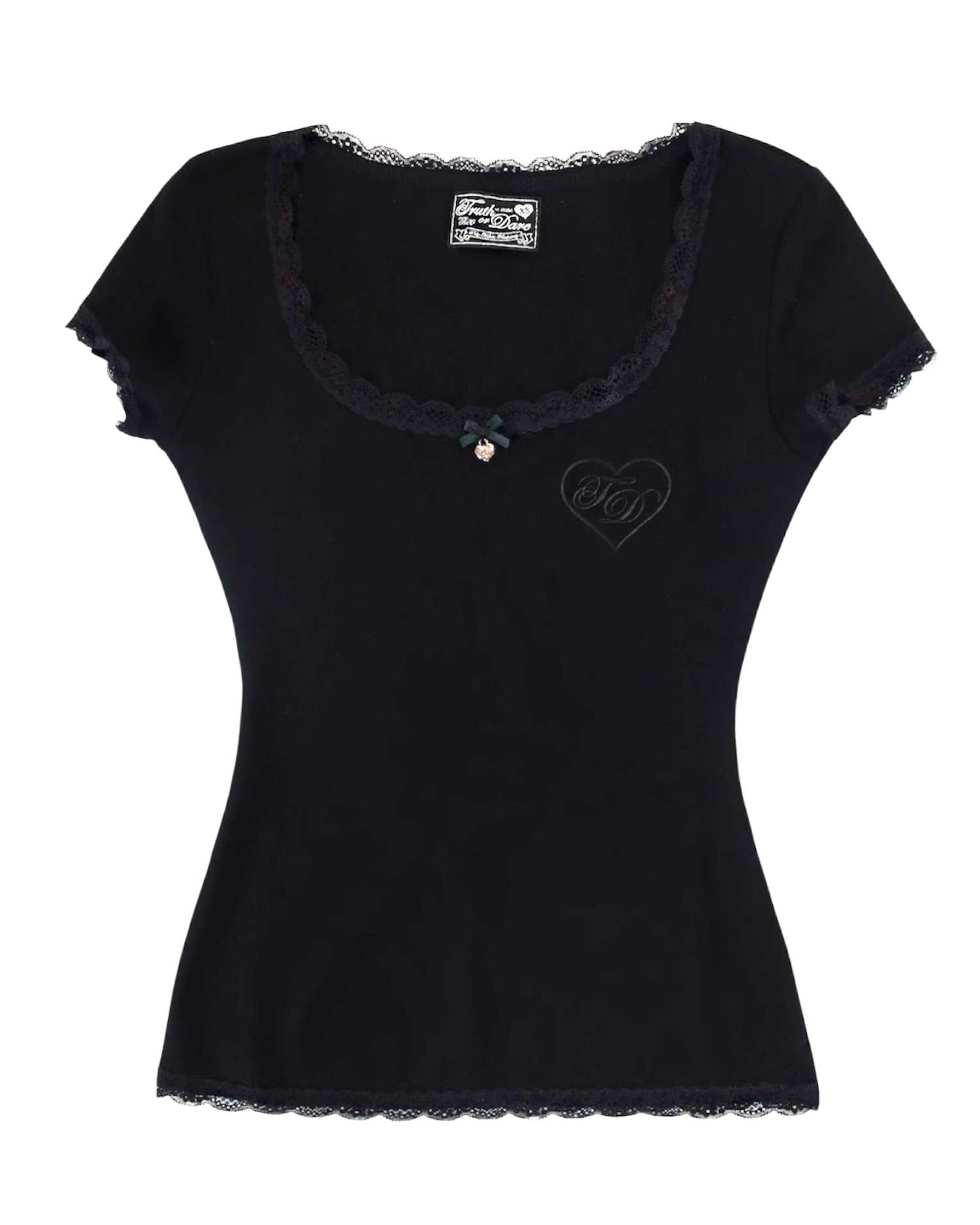The Classic Black Blair features our flattering "Blair" tee fit with a scoop neck, lace and embroidery detailing, and a custom Truth or Dare charm. Note: New Blair shirts are slightly shorter than before to achieve a classic mid-length.