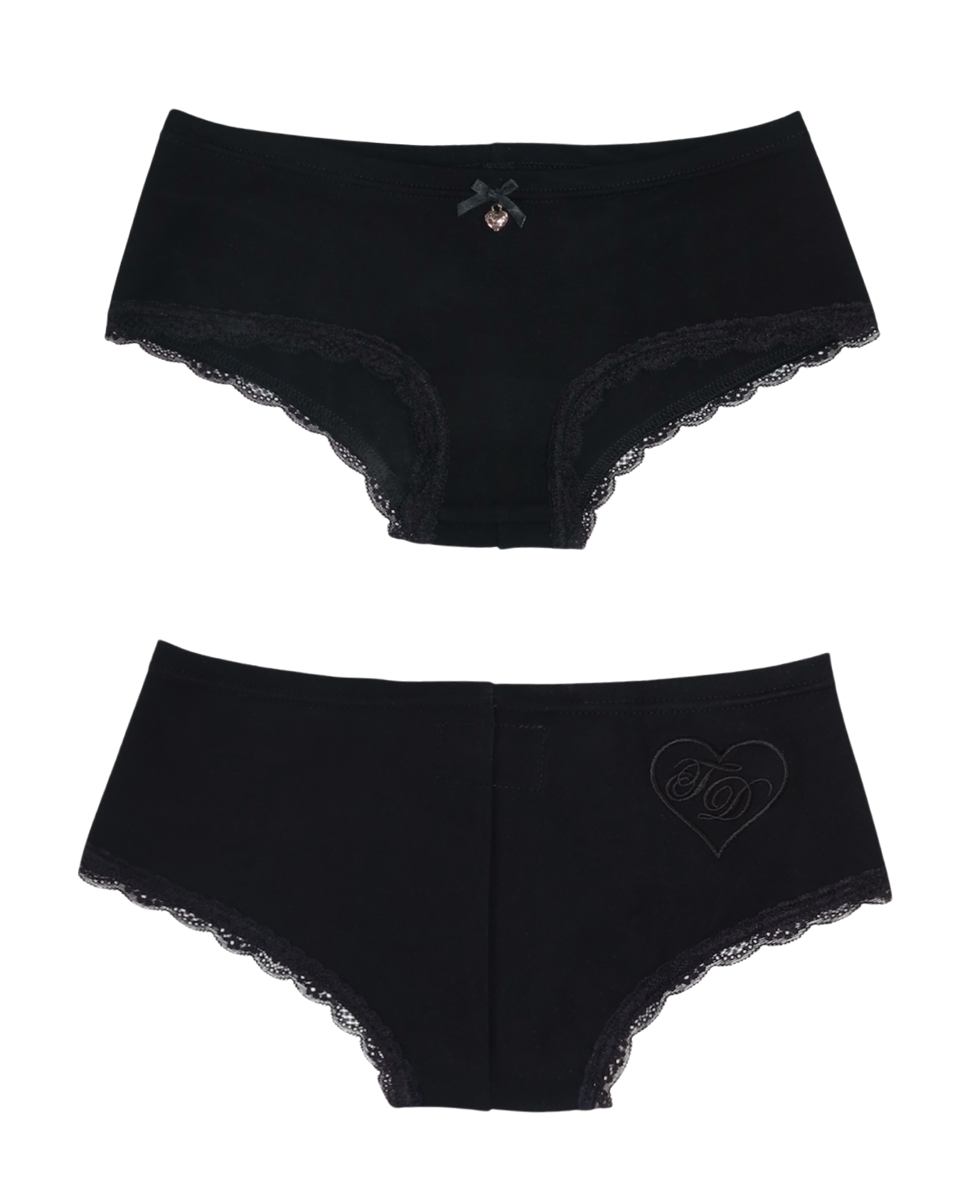 The Classic Black Charlie Boyshorts feature our classic low rise fit, lace and embroidery detailing, and a custom Truth or Dare charm.