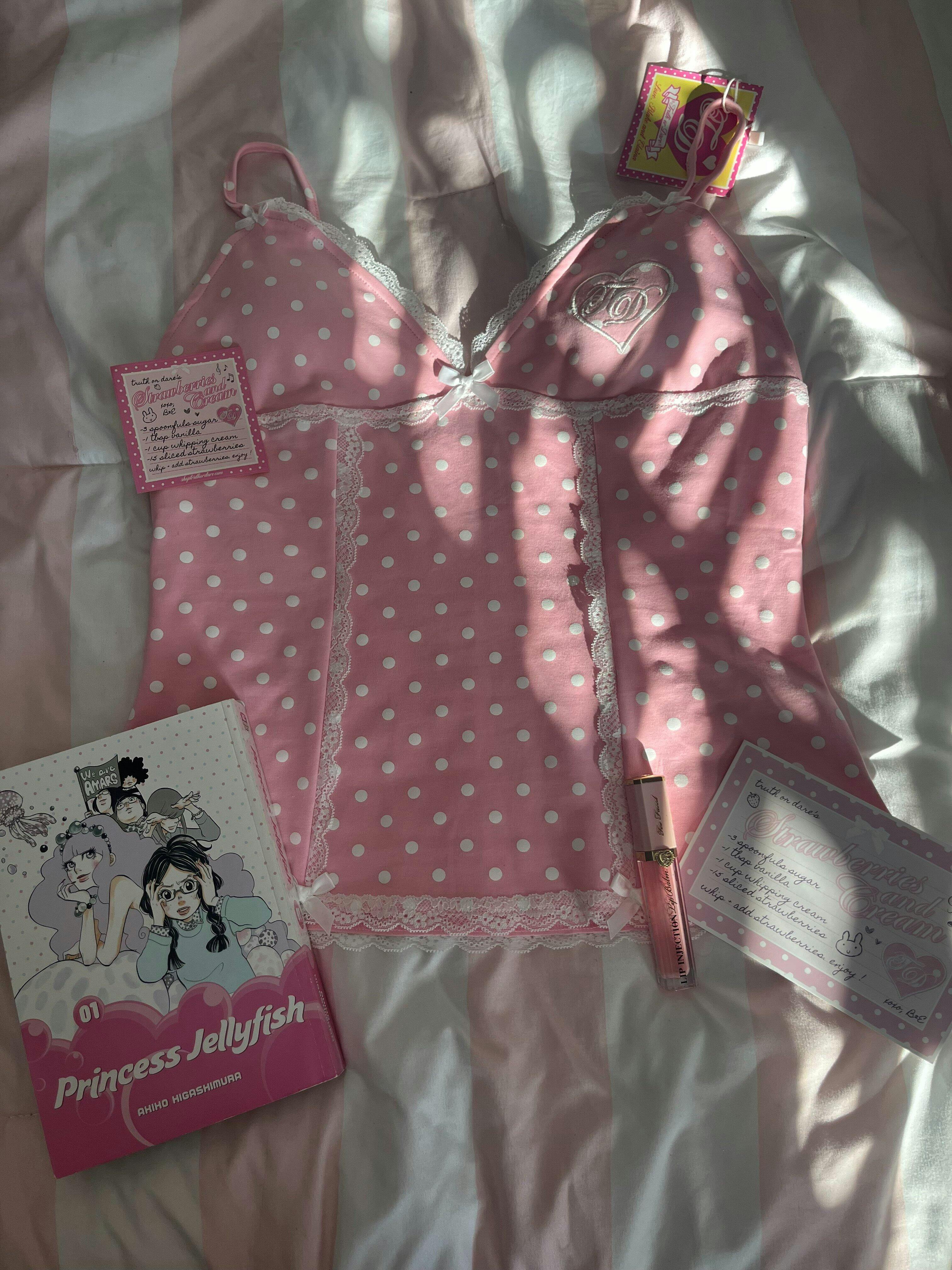 The Strawberries and Cream Charlotte top comes with adjustable straps, bra padding, lace detailing, and bows!
